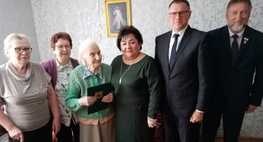 Z tej okazji jubilatkę odwiedził burmistrz Jacek Żurawski. Towarzyszyła mu Zyta Szymańska, kierownik Miejsko-Gminnego Ośrodka Pomocy Społecznej oraz pracownik socjalny. Na tę wyjątkową uroczystość do grona gości dołączył Jacek Zająkała, kierownik placówki terenowej KRUS w Golubiu- Dobrzyniu wraz z pracownikiem Edwardem Lewandowskim.
