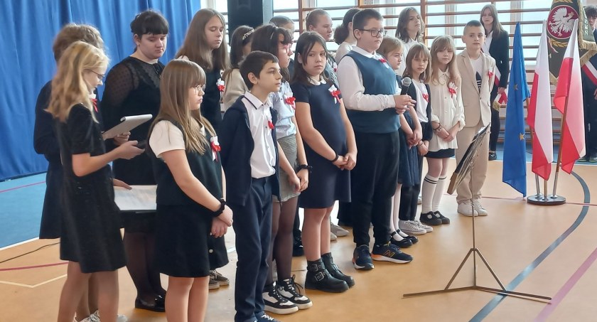 W odświętnie udekorowanej sali gimnastycznej zebrała się cała społeczność szkolna, aby dokładnie o godzinie 11:11, biorąc udział w akcji „Szkoła do hymnu, odśpiewać Mazurka Dąbrowskiego. Następnie uczniowie pod kierunkiem Renaty Gumińskiej i Piotra Bodenszac zaprezentowali montaż słowno-muzyczny. Przypomnieli historię niewoli naszego narodu, począwszy od dnia, kiedy Polska przestała istnieć na mapie Europy jako niepodległe państwo, poprzez dzieje tragicznej walki naszego narodu o wyzwolenie, aż po dzień odzyskania niepodległości. Przekazywane treści były ubogacone patriotycznymi pieśniami, co pozwoliło głębiej przeżyć ten fragment historii.