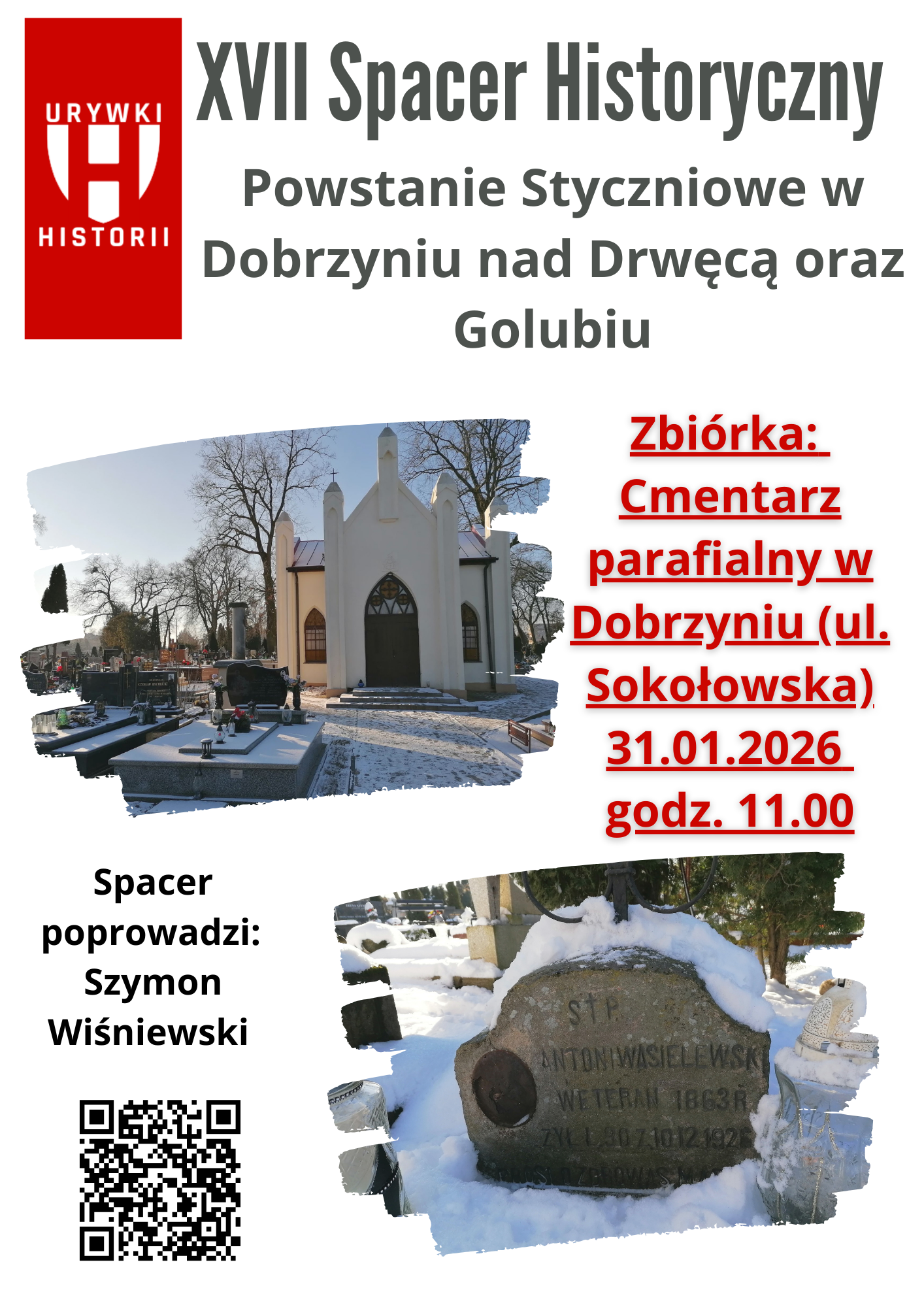 W sobotę 31 stycznia odbędzie Spacer historyczny. To już 17. odsłona tego typu działań, które realizuje nauczyciel historii i regionalista Szymon Wiśniewski. Tym razem tematem spaceru będzie powstanie styczniowe. Zbiórka uczestników spaceru o godzinie 11.00 na cmentarzu parafialnym w Dobrzyniu nad Drwęcą (ul. Sokołowska).