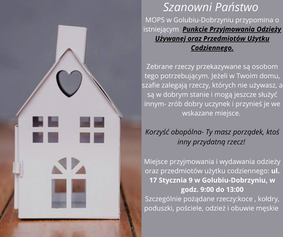 W Golubiu-Dobrzyniu przy ulicy 17 Stycznia 9 działa Punkt Przyjmowania i Wydawania Odzieży Używanej oraz Przedmiotów Użytku Codziennego. Punkt prowadzony jest przez Miejski Ośrodek Polityki Społecznej w Golubiu-Dobrzyniu.