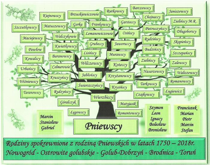 – Pierwsze kroki skierowane były na plebanię golubskiego kościoła. Tam uzyskałem dane metrykalne moich rodziców i dziadków. To wszystko, ale ksiądz, który pomagał mi na plebanii, zasugerował żeby skorzystać z archiwum diecezjalnego, mieszczącego się w Toruniu, w seminarium duchownym przy ulicy Sienkiewicza. Niekończąca się opowieść w postaci genealogii i poszukiwań metrykalnych rozpoczęła się na dobre. W archiwum diecezjalnym spędziłem masę godzin, ślęcząc nad księgami metrykalnymi, ale wszystko ma swój koniec i w tym przypadku tak się stało. Doszedłem w swoich poszukiwaniach do 1849 roku i poniżej tej daty moje nazwisko zniknęło. Jeden z dokumentów z 1888 r. akt zgonu mówił, że mój prapradziadek Gabriel zmarł w wieku 52 lat, a urodził się w Nowogrodzie, w Polsce, z rodziców Stanisława i Marianny, i tyle, i aż tyle. Gdzie ten Nowogród, gdzie w Polsce go szukać? Pomogła mi znowu dobra dusza i zasugerowała, że miejscowość o tej nazwie znajduje się niedaleko nas, a mianowicie niedaleko Golubia-Dobrzynia, lecz akta tej parafii znajdują się we Włocławku i w Archiwum Państwowym w Toruniu. Już na drugi dzień znalazłem się w Archiwum Państwowym i uwierzcie mi, ale otworzyło się dla mnie nie tylko okno, ale brama w poszukiwaniach metrykalnych w parafii Nowogród. W tym archiwum spędziłem wiele godzin, urlopy, a nawet zwolnienie chorobowe spędzałem nad księgami dostarczanymi mi przez przemiłą obsługę. Atutem tego archiwum było to, że można było robić zdjęcia aparatem. To ułatwiało i przyspieszało poszukiwania przodków. Będąc już w domu, przenosiłem foto na komputer i rozpocząłem tworzenie drzewa genealogicznego, które finalnie sięgało roku 1712, a materiały metrykalne pochodziły nie tylko z parafii Nowogród, ale także z sąsiednich parafii takich jak Ciechocin, Działyń, Dulsk, Ruże. W tych miejscowościach mieszkały liczne rodziny Pniewskich, ale też rodziny pokrewne, które powstawały przez małżeństwa kobiet z rodziny Pniewskich z mężczyznami o różnych nazwiskach. Powstały dwa tomy w formie książkowej, w której znalazły się nie tylko dokumenty archiwalne, ale też specjalne karty każdej z rodzin z dokładnymi opisami danej rodziny, schematy drzew genealogicznych poszczególnych rodzin, a także opisy danych miejscowości i różne inne ciekawostki związane z genealogią. Stworzone zostały dwa tomy ze względu na podział poszczególnych rodzin zamieszkujących osobne rejony wokół Golubia-Dobrzynia. Pierwszy tom to rodziny ziemi dobrzyńskiej i drugi tom to rodziny ziemi chełmińskiej, z której ja pochodzę. Nie sposób rozwinąć tu dalszej legendy o mojej rodzinie w tym artykule, gdyż nie starczyłoby miejsca nie tylko w lokalnej gazecie, ale także i na krajowych łamach. Genealogia to jest pewnego rodzaju niekończąca się opowieść i trzeba wiele uporu, determinacji i samozaparcia, aby tę opowieść kontynuować. To trudna dziedzina poszukiwań korzeni swojej rodziny, a nieraz i kosztowna pod względem finansowym i wielu poszukiwaczy rezygnowało z tej zabawy w genealogię, zanim ją na dobre rozpoczęły. W czasach, gdy zajmowałem się genealogią, musiałem wiele czasu przebywać w archiwach, a nawet wyjeżdżać do archiwum w innych miejscowościach. Po digitalizacji zbiorów archiwalnych województwa kujawsko-pomorskiego zbiory archiwalne są udostępnione w internecie i można z nich korzystać na stronie – genealogiawarchiwach.pl. W bibliotece w Golubiu-Dobrzyniu miałem kilka spotkań na temat związany z genealogią i historią o naszej małej ojczyźnie. Poznałem tam wielu wspaniałych ludzi z Ewą Kaźmierkiewicz na czele, która pracowała w bibliotece. Na jednym ze spotkań poznałem Stanisława Rumińskiego, które jak się okazało po analizie dokumentów, że mamy wspólnego przodka. Potem już razem opracowywaliśmy nasze drzewa, a przyjaźń ze Stasiem trwa do dzisiaj. Były to dla mnie piękne i niezapomniane chwile, których do końca życia nie zapomnę.