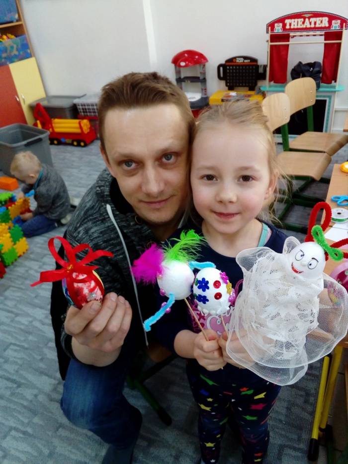 Tematem przewodnim warsztatów świątecznych był pisanki materiałowe. Rodzice oraz dzieci poznały nową technikę zdobniczą, która polegała na dekorowaniu jajek styropianowych materiałem, wstążkami oraz innymi ozdobami. Wszyscy wykazali się dużą pomysłowością oraz kreatywnością. Wspólnie spędzony czas wprowadził dzieci oraz rodziców w wielkanocny nastrój.