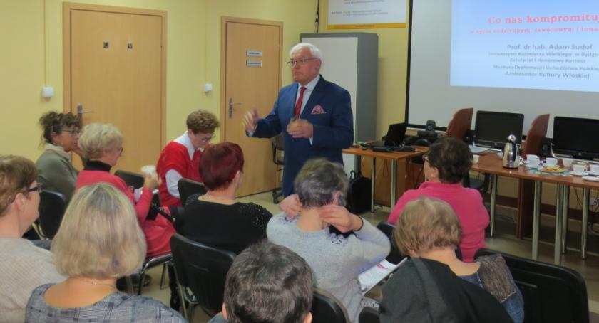 Słuchacze Uniwersytetu Trzeciego Wieku po raz pierwszy w tym roku spotkali się na wykładzie. Temat zajęć brzmiał: „Co nas kompromituje w życiu codziennym, zawodowym i towarzyskim”. Zajęcia prowadził znany niektórym słuchaczom prof. dr hab. Adam Sudoł z Wyższej szkoły Gospodarki w Bydgoszczy. Temat bardzo intrygujący i przydatny na pewno wielu ludziom, a nie tylko słuchaczom UTW. Prowadzący wykład w bardzo umiejętny sposób wciągnął uczestników wykładu w jego treść, stosując technikę wspólnego dyskursu. Co można było się dowiedzieć z tego spotkania?