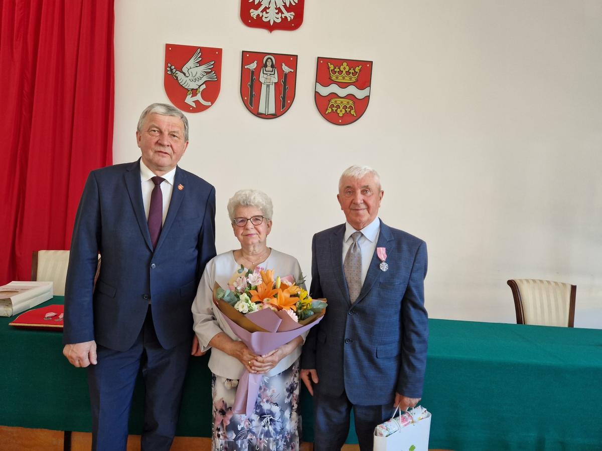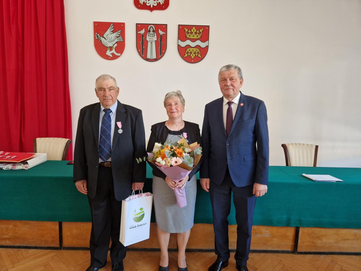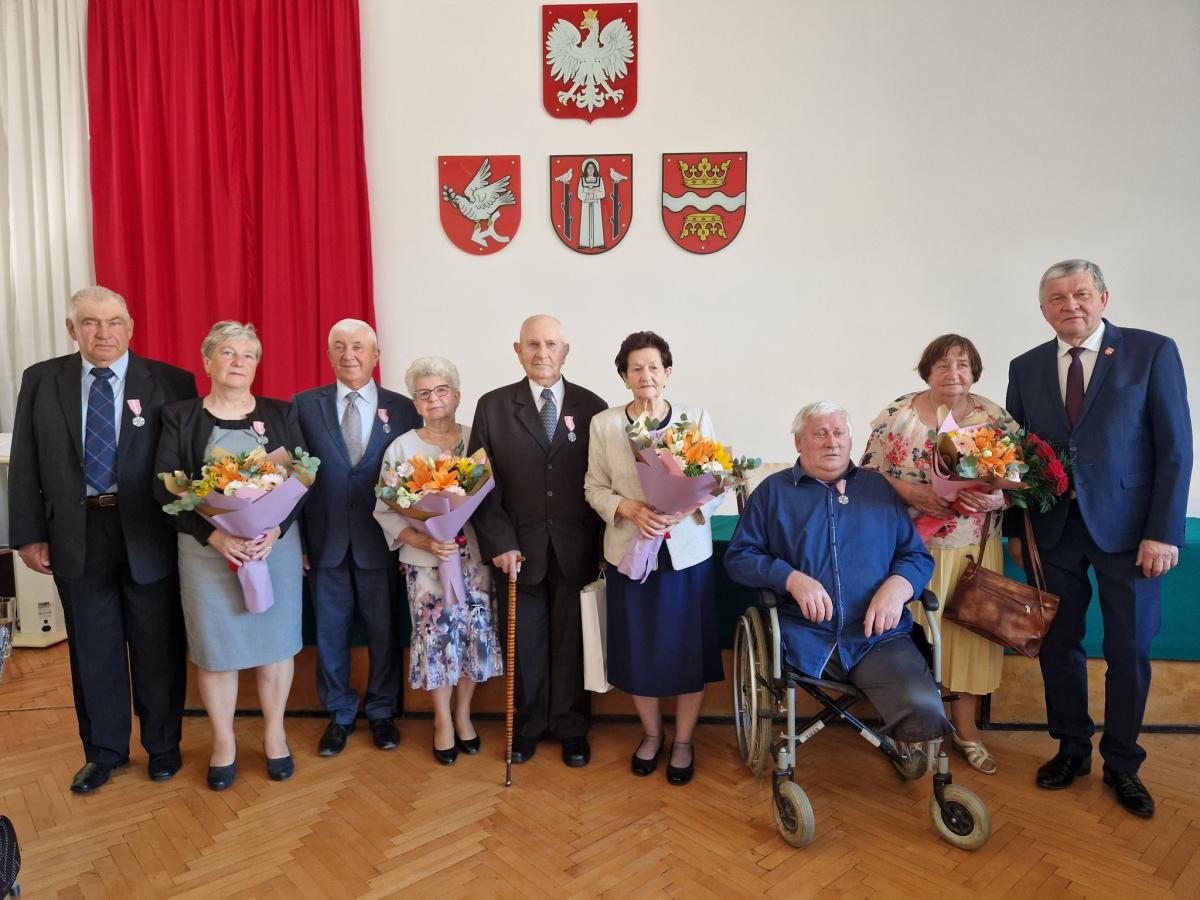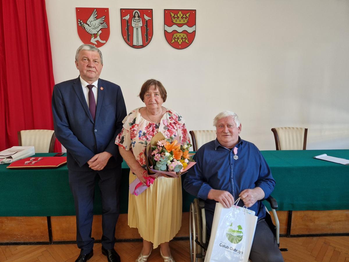 Galeria zdjęć przedstawiająca uroczystość obchodów żelaznych godów, czyli 65 lat małżeństwa jubilatów z gminy Golub-Dobrzyń. Wśród uczestników można zobaczyć dostojnych jubilatów oraz ich rodziny i przyjaciół, którzy świętują wspólnie. Wójt Marek Ryłowicz składa słowa uznania i podziękowania parom, które są wzorem i przykładem długotrwałego małżeństwa. Zdjęcia ukazują wręczanie medali, pamiątkowych listów gratulacyjnych oraz bukietów kwiatów, które są symbolem uznania i szacunku dla jubilatów. To wzruszające i piękne wydarzenie, które celebruje miłość i poświęcenie trwające przez wiele lat.